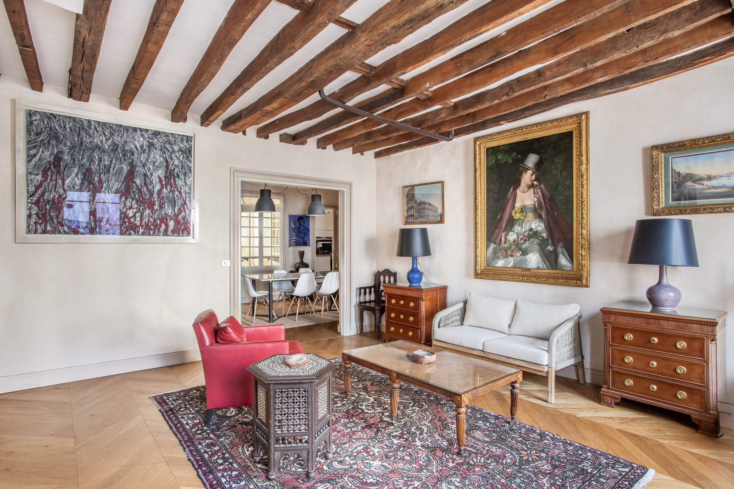 salon lumineux sur rue d’une superficie de 24m² avec poutres apparentes, une chambre avec de