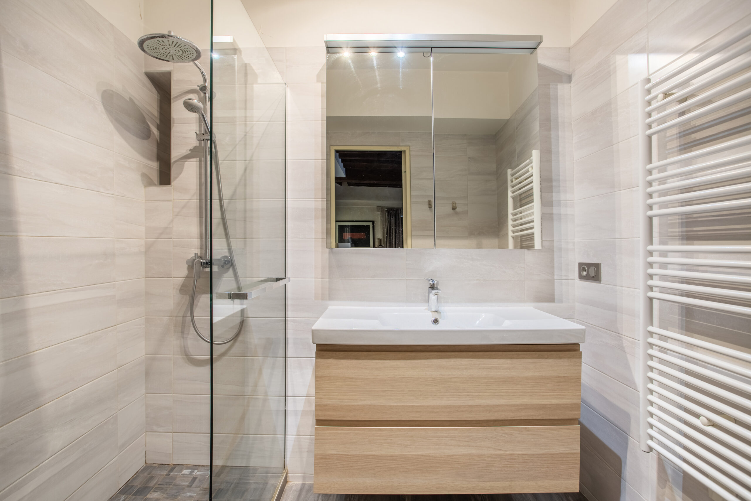 nombreux rangements et placards, une salle de douche et un toilette séparé.